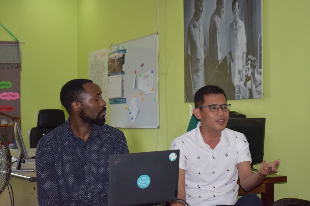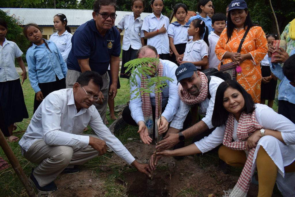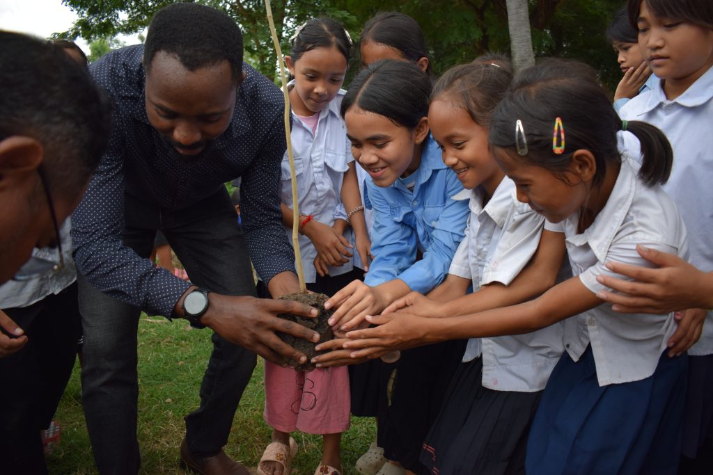 Students at the Seri Santay Primary School engage in the Stuck on the Island activity during the Peace Club lesson on “Brainstorming”.Mok Aim interprets for the visiting MCC India team during the Stuck on the Island activity. This activity is part of the Peace Club lesson on Brainstorming.Mainza Hanzukule plants a sapling with 5th Grade Peace Club students from the Seri Santay Primary School. The students will be taught to care for the sapling as it grows and the trees will be used as an concrete example during the lesson on the Environment and Peace.The District Education Officer, School Principal, and visiting MCC Representatives join together to plant a tree on the Seri Santay Primary School grounds after the Peace Club lesson during the Life Skills class. The students will be taught to care for the tree during the ongoing Peace Club and the trees will be used as an concrete example during the lesson on the Environment and Peace.Bilon Ruga hands out snacks after the peace club lesson at Seri Santay Primary School in Ba Phnom district, Prey Veng province.Mainza Hanzukule and Mok Aim explain the project logframe and data collection mechanisms at the MCC field office in Prey Veng town.