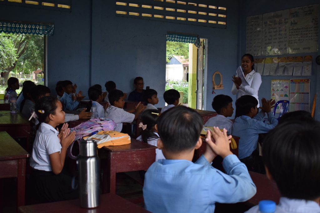 Hoeun Raksa greetings the 5th Grade Peace Club during the Life Skills class at the Seri Santay Primary School in Ba Phnom district, Prey Veng province.